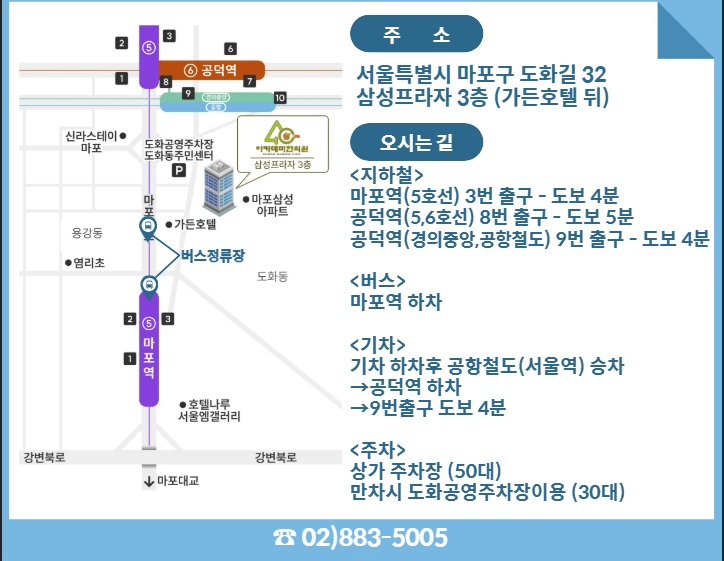 주소 : 서울시 마포구 도화길32, 삼성프라자 상가 308호 | 전화 : 02-883-5005, 02-702-0120
